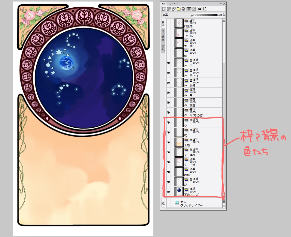 背景の枠のデザインはさらっとしか描いてないのが残念ですね。