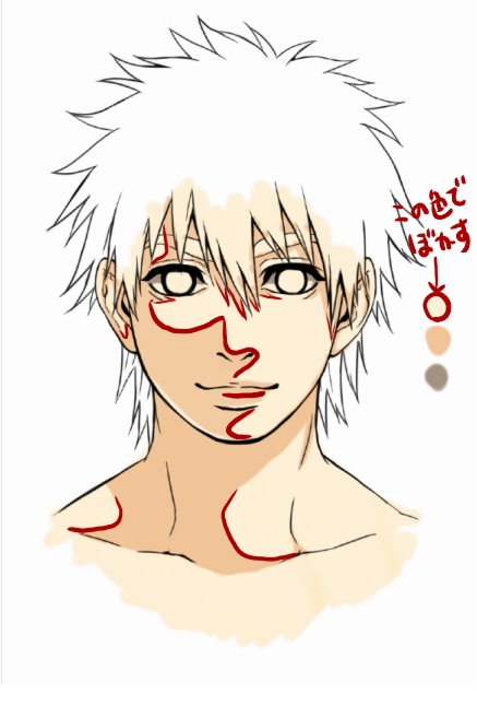 凹凸のある部分に薄く重ね塗りして、鼻の輪郭?や上唇、髪の毛が掛かる部分等はくっきり、頬や首の影は上手い具合にグラデーションで塗る。